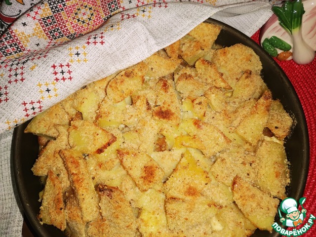 В форму, смазанную маслом, выложить курицу, сверху разложить картофель, заправить все получившимся соусом. Присыпать сухарями.