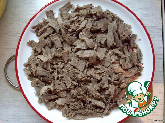 Берем хороший кусок говяжьей вырезки, отвариваем его,