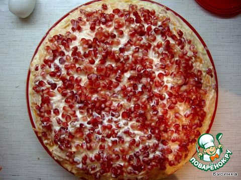 Каждый слой (кроме граната сверху) обильно смазываем майонезом, у меня на салат 4,5 кг уходит 600 мл майонеза.