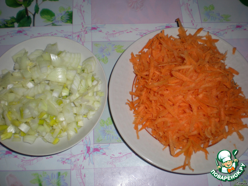 Морковку натереть на крупной терке, лук мелко порезать. Сделать зажарку на растительном масле.