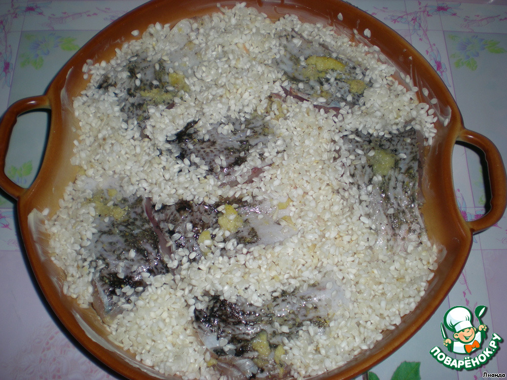 Рис промыть и засыпать в оставшиеся между рыбой промежутки.
