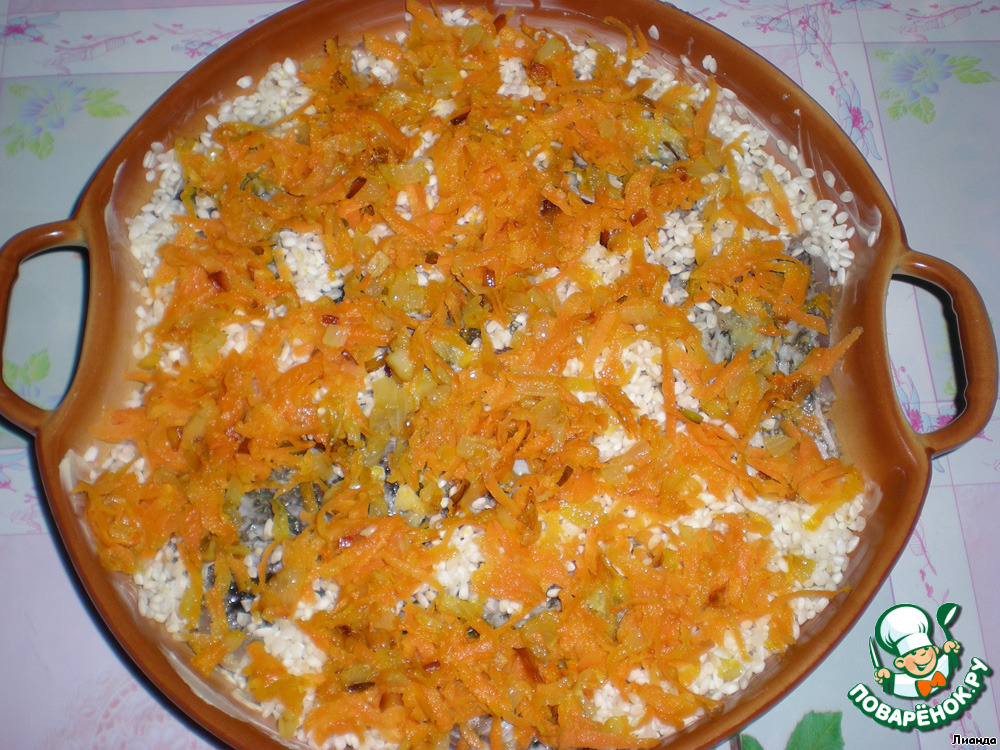 Сверху равномерно распределить зажарку. Посолить по вкусу. Сверху залить горячей водой так, чтобы она покрывала рис и рыбу на 1 см. Много воды лить не нужно, лучше при приготовлении подливайте по необходимости. Я подливала минут через 30.
