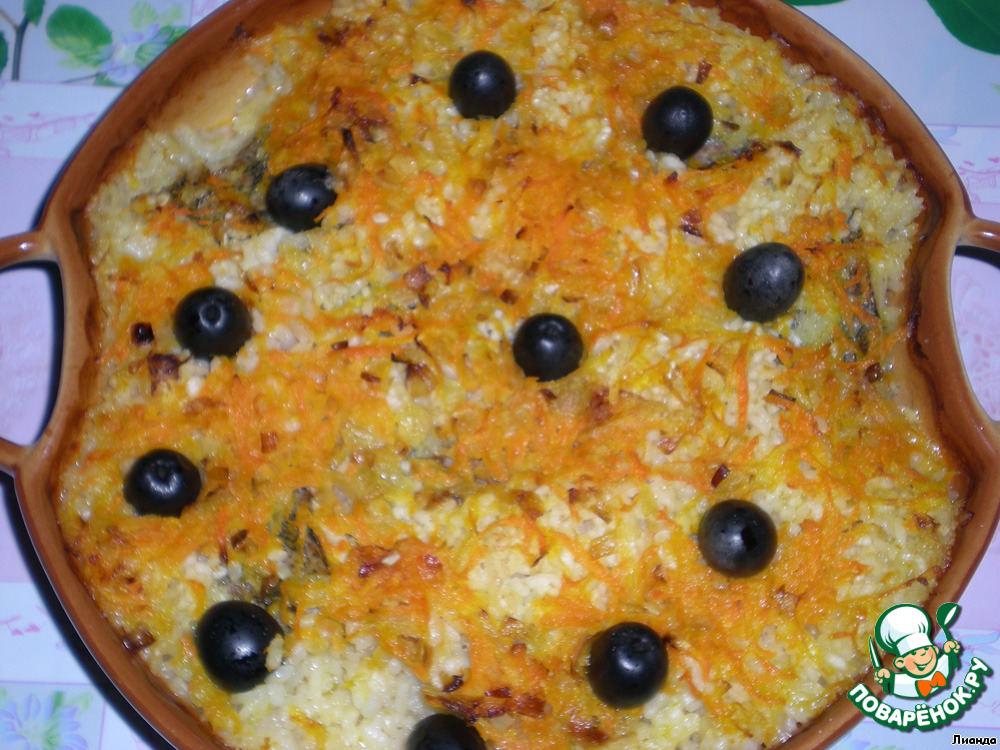 Поставьте в духовку на 50 мин при температуре 160*. Когда рис станет мягкий, можно вынимать. Добавьте горсточку маслин.