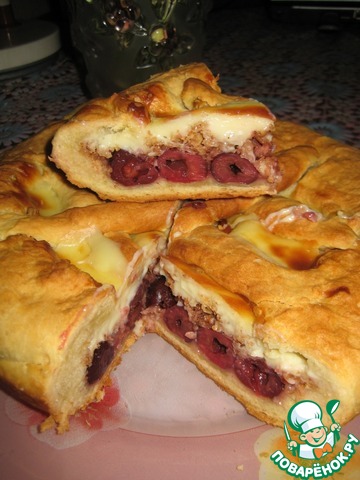 • Тесто раскатать в квадратный пласт толщиной 0,4-0,5см. Выложить в смазанную форму (диаметром 24-26см), чтобы края свисали. Сверху выложить вишню.