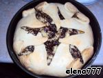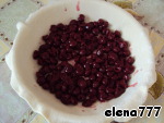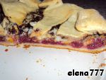 Тесто раскатать в квадратный пласт толщиной 0,4-0,5см. Выложить в смазанную форму (диаметром 24-26см), чтобы края свисали. Сверху выложить вишню.