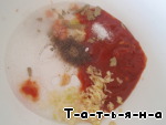 Приготовим маринад: в газированную воду положить томатный соус, измельченный чеснок, лавровый лист, соль, перец и перемешать.