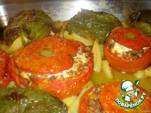 Начините овощи, не до конца и не утрамбовывая, положите поверх фарша фету, закройте шляпкой. Выложите овощи в форму близко друг к дружке. Полейте оливковым маслом, добавьте чуть водички. Можете добавить картофель.