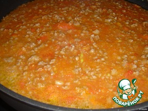 Мякоть с помидоров измельчить в блендере. На оливковом масле (3-4 ст.л.) чуть обжарить мелко нарезанный лук, добавить чеснок. Добавить фарш и всё обжарить 5 мин. Подлить соус из мякоти, томат-пюре, кетчуп, специи, мелко нарезанную зелень. Всыпать рис. Если у Вас не слишком сочные помидоры, и соуса у Вас получилось не много, можете чуть подлить водички. Рис должен потушиться 5-7 мин, но жидкость должна в процессе вытушиться. Поэтому постоянно помешивайте начинку. Охладите. -
