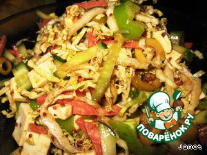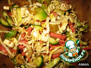 Капусту покрошить, сыр "Фетакса с оливками и паприкой" еле порезала кубиком. В другие разы, когда готовила салат, потёрла на самой крупной тёрке, получилось быстрее и без сложностей!