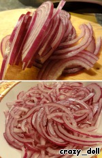Лук нарезать тонкими полукольцами, ошпарить кипятком и сразу же промыть холодной водой - так лук останется хрустящим и совсем не будет горчить.