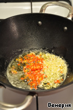 В разогретое масло добавить измельченные чеснок и перец чили, обжарить в течении 1-2 минут. -
