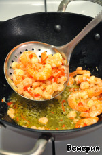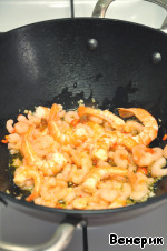 Туда же добавляем очищенные креветки, обжариваем 2-3 минуты.