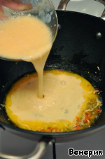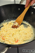 Жарим, помешивая лопаткой, 2-3 минуты, пока не свернутся яйца.