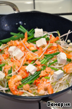 Всыпать ростки сои, креветки, лук-порей, сыр тофу, арахис. Перемешать и жарить ещё 3 минуты.