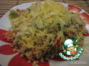 • Теперь займемся кус-кусом. Так как это крупа очень мелкая и нежная, то достаточно залить его кипятком и он уже готов. Так и поступаем. И еще добавляем 1 ст. л. масла растительного.