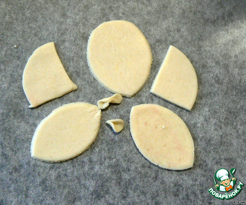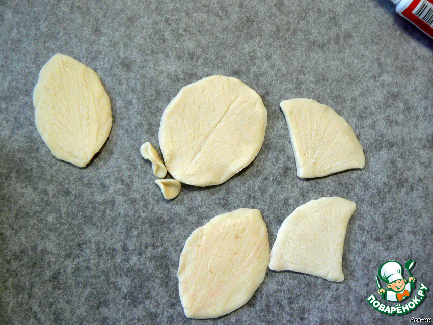 Раскатываем марципан в тонкий лист и вырезаем, с помощью вырубок, ножа или бокалом, вот такие детали.