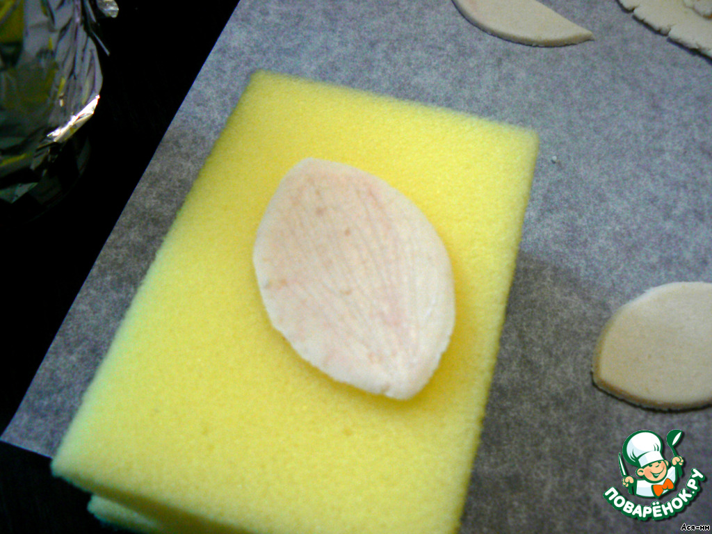 С помощью ножа на деталях делаем насечки для прожилок, затем края детали прижимаем пальцем, чтобы сделать их тоньше и натуральнее.