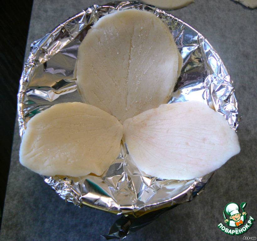 Прикрепляем две детали в виде четвертинок. Под них я положила небольшие кусочки смятой фольги, чтобы придать дополнительный объем изделию. Также раскрашиваем эти детали. Для серединки я взяла небольшой кусочек массы и прокрасила его полностью, добавив немного пудры. Сделала из цветной массы две детальки и прикрепила их в середину. Между ними вклеила маленький шарик из белой массы. Оставляем цветочек сохнуть примерно на 2 суток.