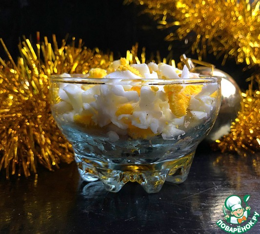 Сваренные в крутую яйца, безжалостно порубить (не такие они и крутые). Посыпать останками содержание салатницы. И! Мельничкой, смолоть черный перец.