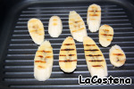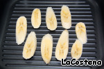 Сковороду-гриль нагреваем, выкладываем на нее кусочки банана.