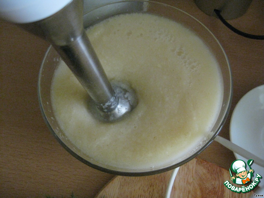 Манку положить в глубокую посуду, залить кипятком, взбить блендером, чтобы не было комочков.