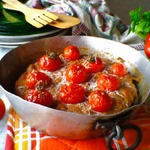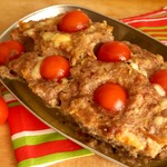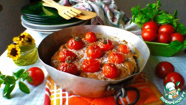 Выпекать в духовке 35-40 минут при 180*С, пока фарш не подрумянится, а помидорки не начнут лопаться. Если во время выпечки появляется много жидкости, то я её сливаю. -