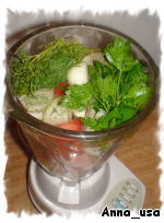 Очищенные помидоры, укроп, петрушку, лук (порезанный на кусочки), базилик и мяту, сложить в блендер и превратить в пюре.