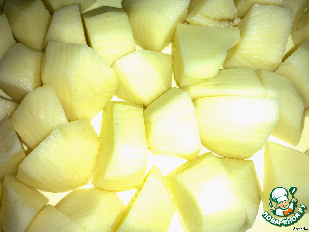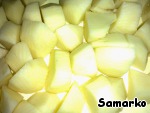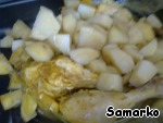 Курочку помещаем в рукав на спину, внутрь живота помещаем кусочки картофеля, образуя горку. Завязываем пакет, протыкаем в нескольких местах и отправляем на час в духовку, нагретую до 180 градусов.