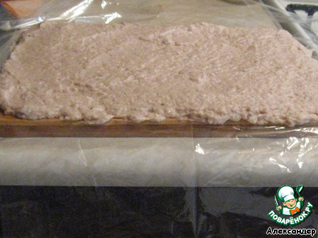 На разделочную доску выкладываем рукав для запекания, который надо предварительно разрезать по шву. На рукав ровненько кладем рыбное суфле. Шпинатный омлет достаем из и духовки. Даем ему немного остыть, переворачиваем на суфле.