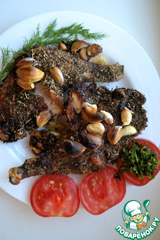 Рецепт «Куриные окорочка под томатным соусом с запеченными дольками чеснока»:
