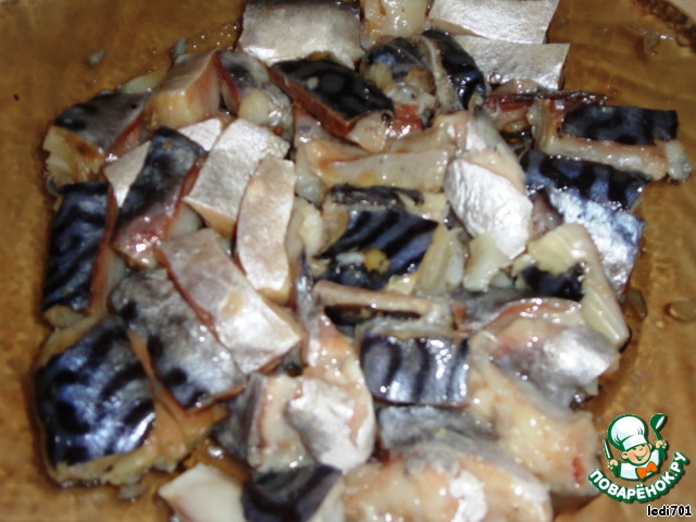 Скумбрию почистить, выпотрошить, снять кожу, нарезать некрупными кусками.
