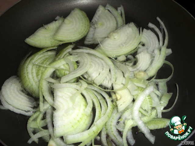Лук нарезать полукольцами. И обжарить на растительном масле.