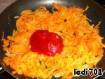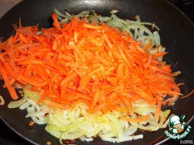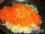 К луку добавить морковь, натертую на крупной терке, обжарить.