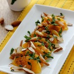 Сочные апельсины, липко-сладкие финики, свежие листики мяты и хрустящий миндаль очень гармонично сочетаются в этом салате. Подавать охлажденным в качестве свежего десерта или закуски-гарнира к мясу с гриля, для любителей сладко-соленого вкуса.