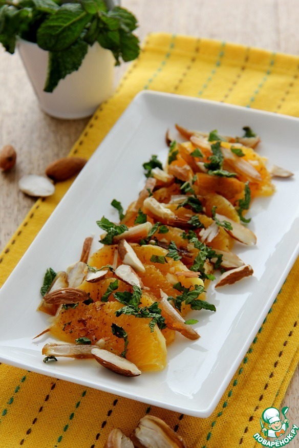 Составить салат: на блюдо положить слой апельсинов, посыпать финиками и миндалем, украсить нарезанной мятой. Приятного аппетита!