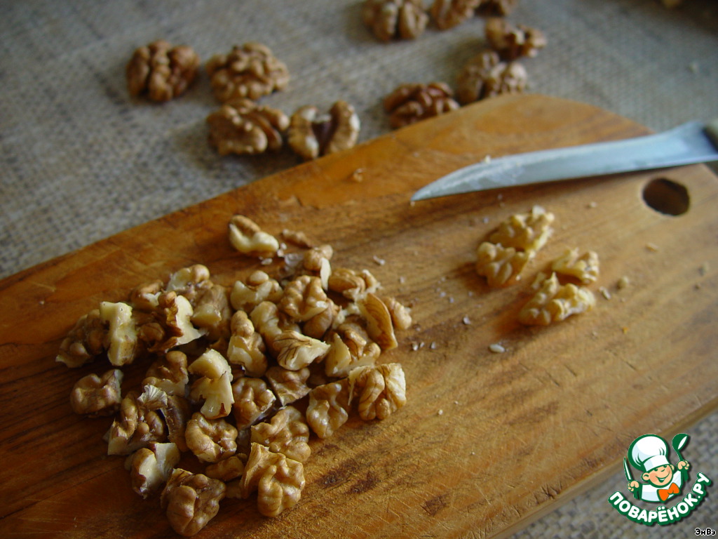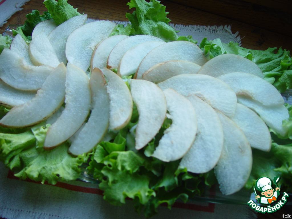 Сыр распределяем равномерно по грушевому слою, посыпаем орехами. Вот и все. Оставшийся соус подаем отдельно. На случай, если кому-нибудь покажется, что его мало.