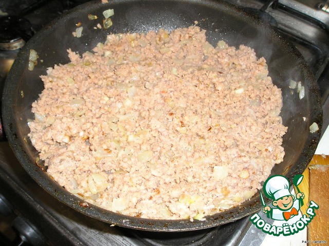 13. В одну часть лука добавляем капусту, в другую фарш и поджариваем в течение 20 минут до готовности!