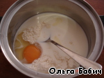 Смешать сгущенное молоко, сахарную пудру, молоко, яйцо, муку.