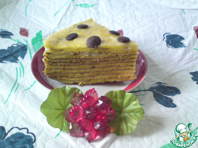 В блендере смешиваем тыкву, сахар, яйца, муку, соду, сок и мякоть одного апельсина, сгущенное молоко. Выкладываем на сухую раскаленную сковороду ложкой тесто и обжариваем до зарумянивания с двух сторон. Должно получиться примерно 7-8 тонких коржей.