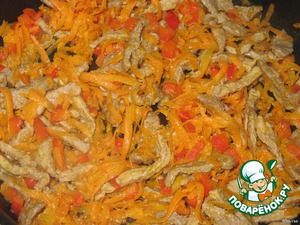 Обжарить мясо с натертой морковью и нарезанным перцем, посолить.