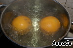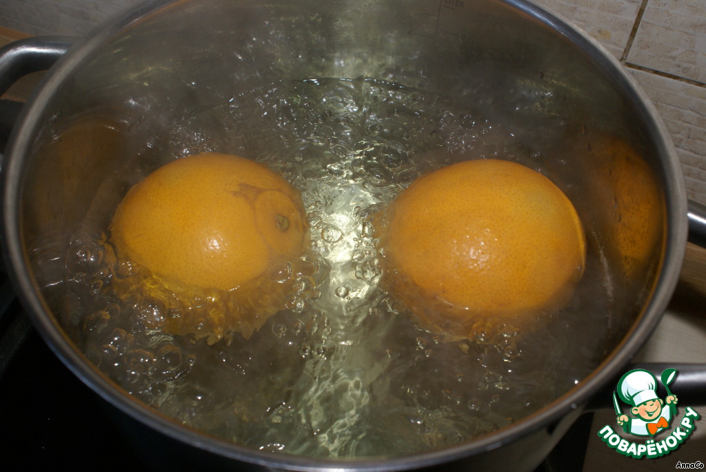 Апельсины залить водой и поставить их вариться. Когда вода будет покрывать меньше половины апельсина - выключить и дать остыть.