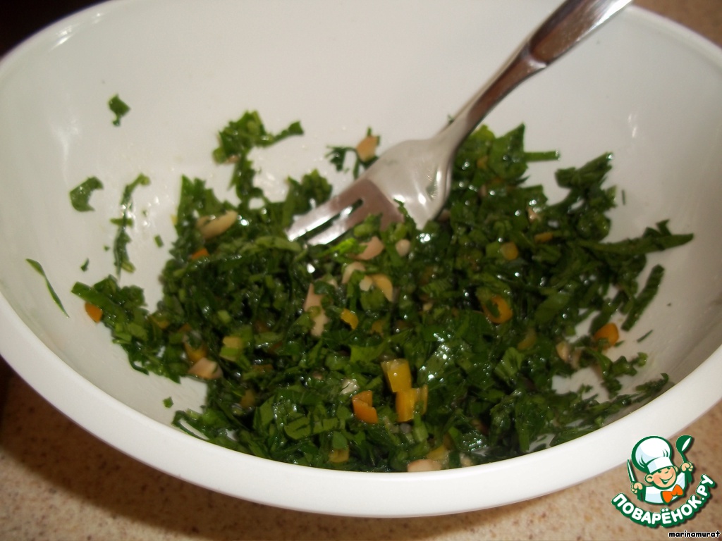 Делаем начинку. Петрушку, чеснок, листики мяты (крупные), острый перчик (у меня не было красного, был какой-то полужелтый-полукрасный и я еще добавила зеленого остренького) кладем в комбайн и измельчаем (можно и вручную все мелко порезать). Я еще добавила 4 оливки, захотелось почему-то:) Добавляем уксус и масло, соль и черный молотый перец - по вкусу, и хорошо перемешиваем.