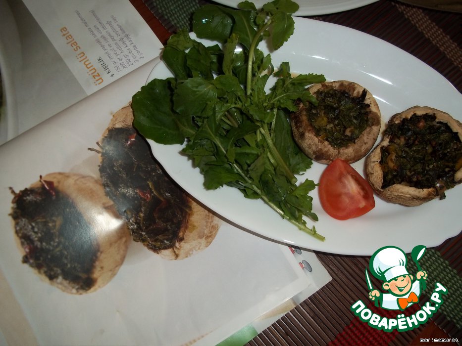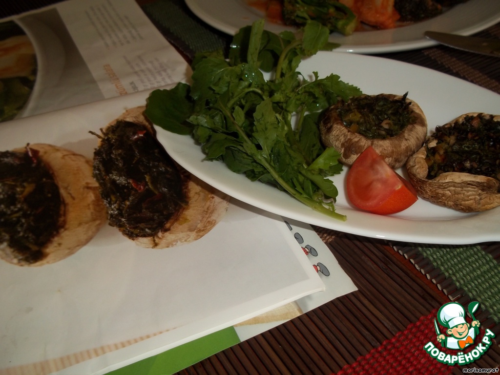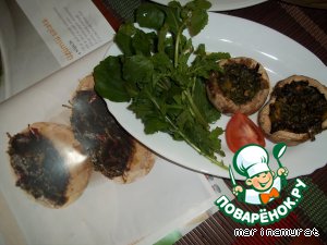 Фаршируем наши грибочки и ставим в разогретую до 200 градусов духовку на 15 минут.