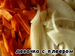 Лук режем полукольцами, морковь - небольшими брусочками. -