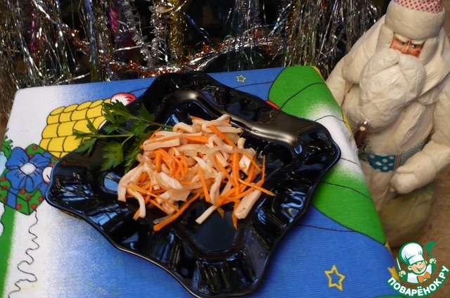 Очень вкусная закуска для любителей кальмаров. Рецепт этого блюда был размещен на сайте в 2008 году пользователем Dashulja под названием "Кальмар в маринаде" и иллюстрирован мной в рамках акции "Раскраски". В исходном варианте рецепта уточнялось, что изначально рецепт был взят из журнала "Школа гастронома".