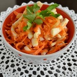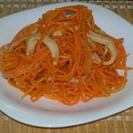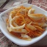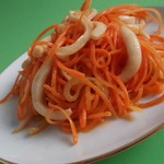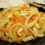 Вкус закуски меня немного удивил, в хорошем смысле... Я думала, что по вкусу будет примерно, как морковь по-корейски с кальмаром. Вкус оказался иной. Менее острый и за счет добавления в маринад душистого перца и гвоздики, оказался чем-то похож на "Рыбу под маринадом". Мне очень понравилось, буду готовить еще.