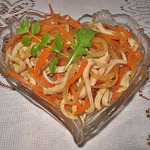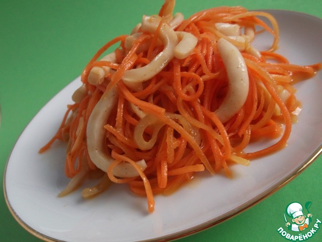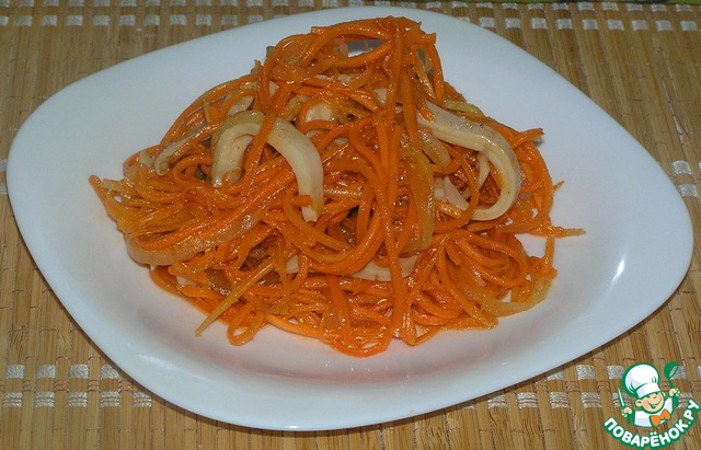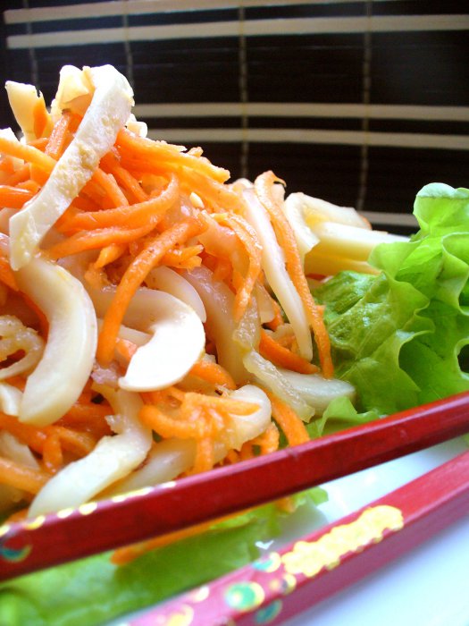 Морковь трем на терке для корейской моркови (или можно нарезать очень тонкой соломкой). Кальмаров режем соломкой.