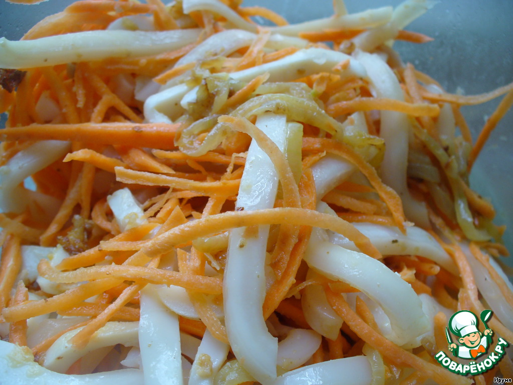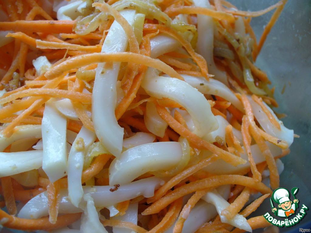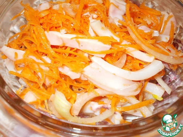 Смешиваем кальмаров, морковь, лук. -