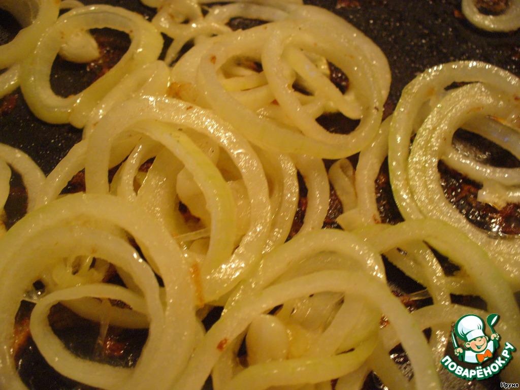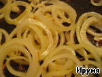 Лук очистить и нарезать кольцами. Обжарить 5 минут в масле, оставшемся от жарки кальмаров.