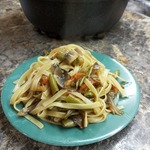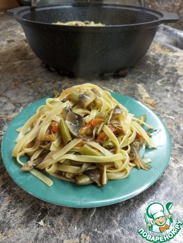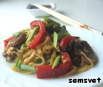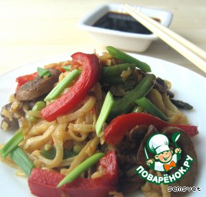 Нежная лапша с ароматными грибами и сочными, яркими овощами представляет собой полноценное блюдо, но может быть подана и в качестве гарнира. Лапша в таком исполнении получается очень сытная и нарядная, и при этом низкокалорийная и постная. Рецепт этого блюда был размещeн на сайте в 2008 году пользователем Evgeniya19899449 под названием "Лапша "Ло-Мин"" и иллюстрирован мной в рамках акции "Раскраски".